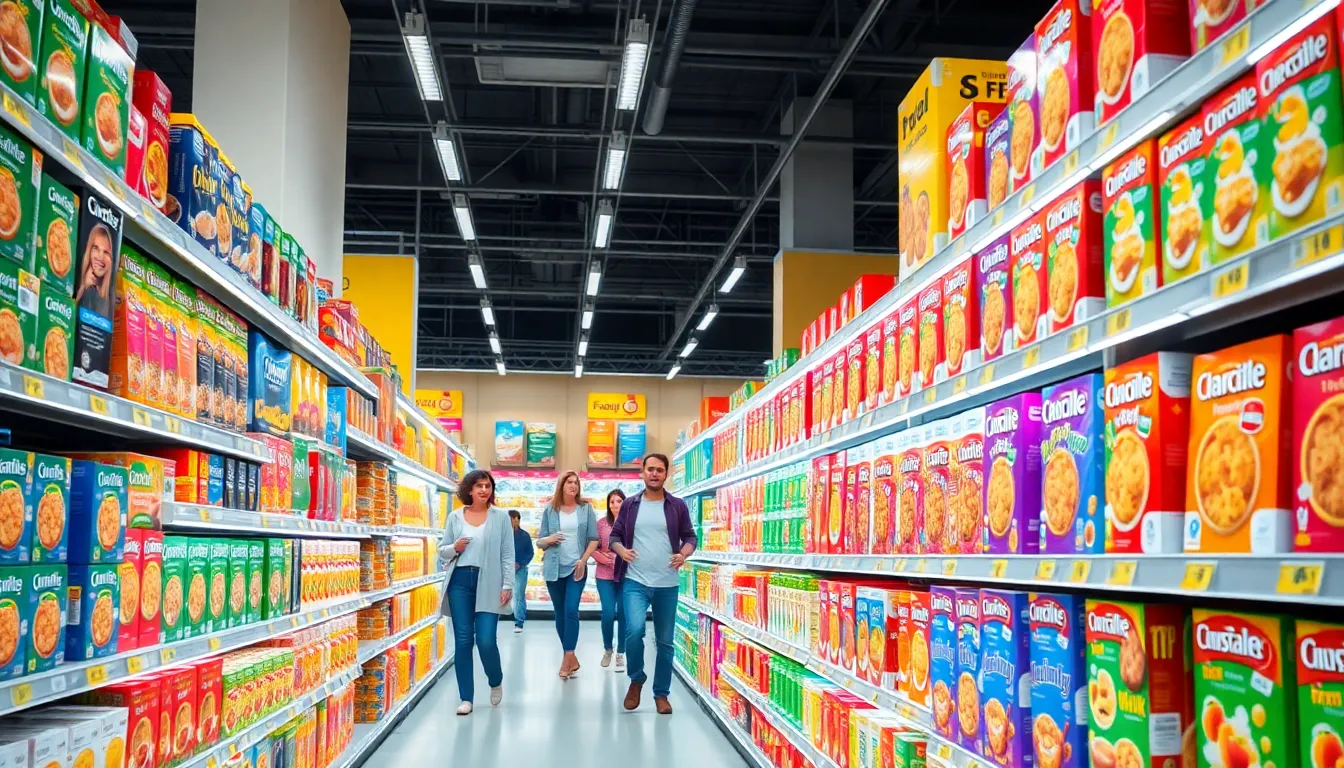 shoppers exploring a diverse cereal aisle in a grocery store.
